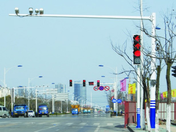 道路監(jiān)控桿也稱(chēng)監(jiān)控桿與監(jiān)控立桿,立桿要求攝像機(jī)離地面高度一般不低于5米,挑臂長(zhǎng)度3~5米,立桿下端管徑應(yīng)在220 mm±10mm、上端管徑應(yīng)在120 mm±5mm,管壁厚度應(yīng)≥6mm,表面防腐、抗臺(tái)風(fēng)。立桿基礎(chǔ)深度不低于1.5米,基礎(chǔ)直徑大于1米,采用混凝土灌筑,以確保立桿的牢固度。